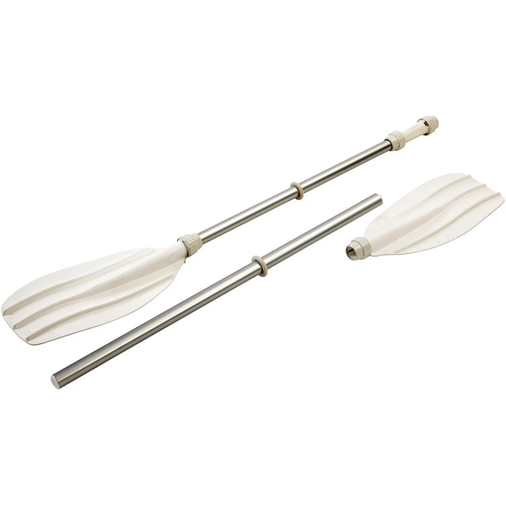 Comes with an aluminium shaft with plastic blades which is demountable to a length of 110cm for each paddle.