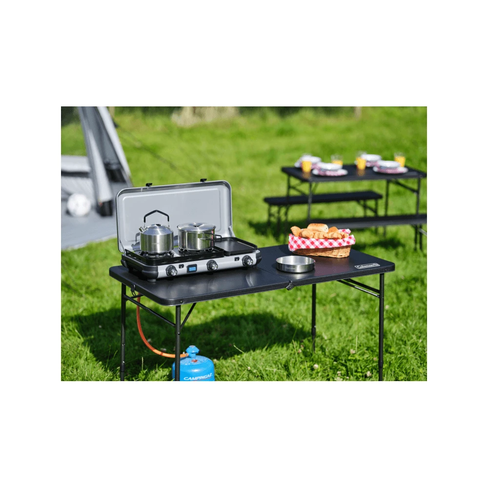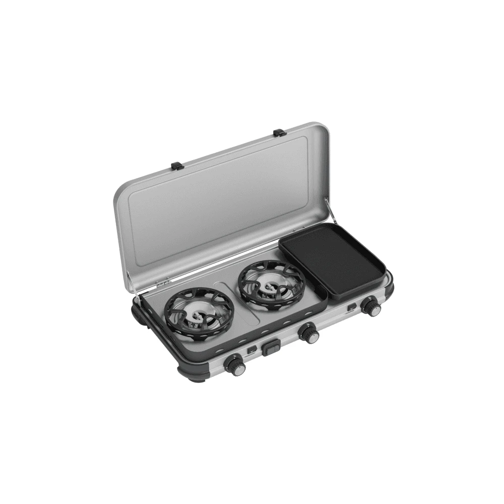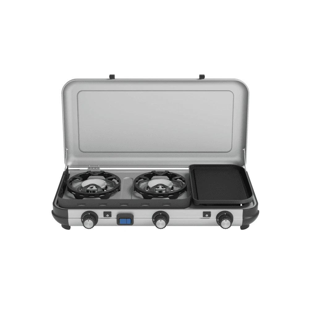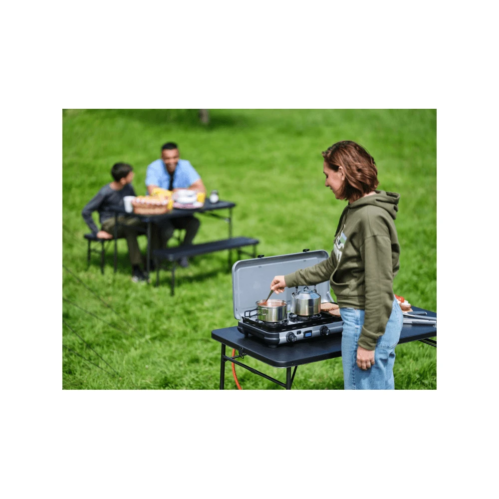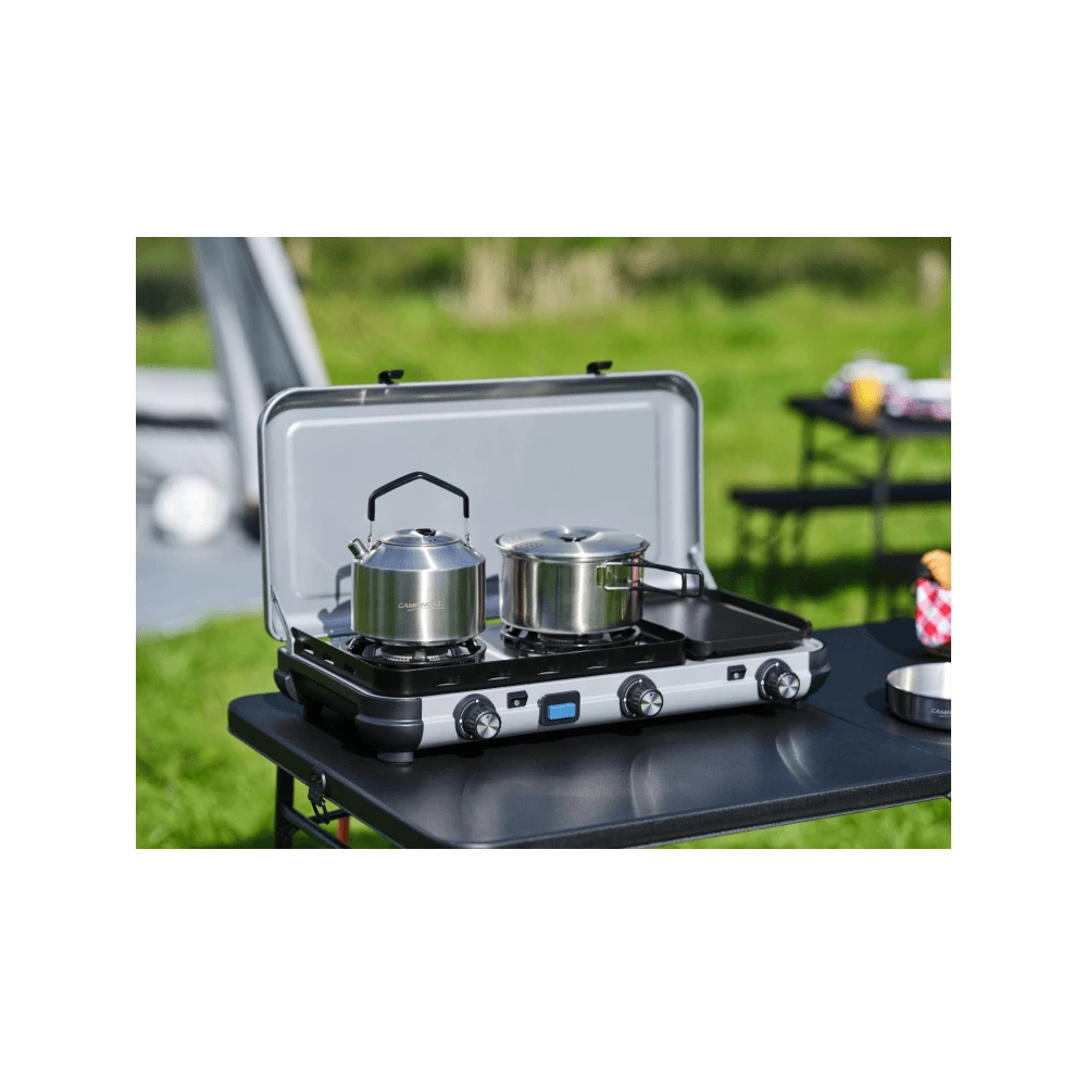 This double burner stove with additional griddle from Campingaz provides multiple cooking options, making it ideal for family camping trips and longer stays.