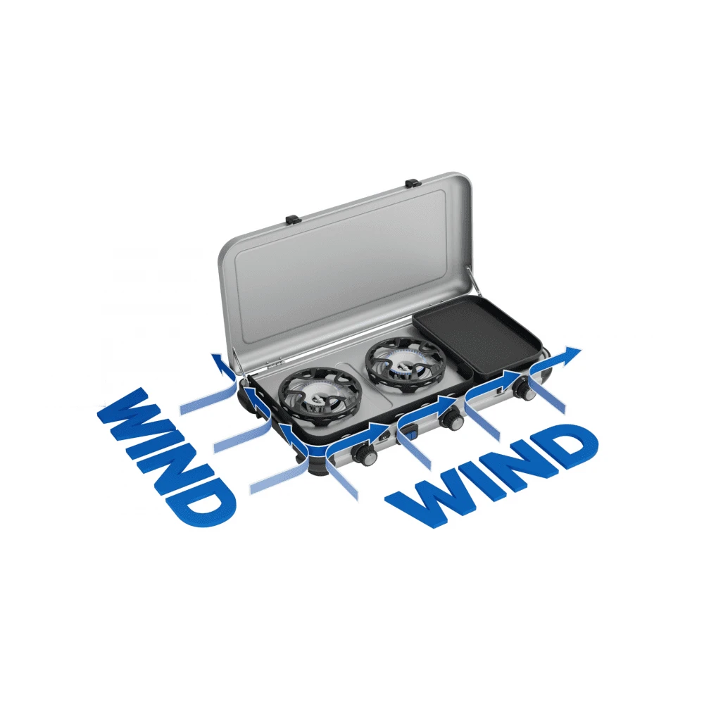 CAMPINGAZ® FLAMEGUARD: Get cooking fast and efficiently under windy conditions (3m/s), by consuming at least 50% less gas, and boiling water 30% faster as previous CAMPINGAZ® 2 burner stoves