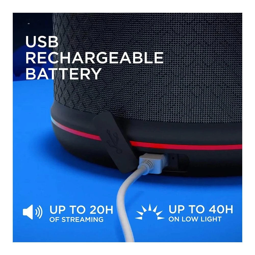 A rechargeable lithium-ion battery with a USB port for charging makes it easy to pack up and go, and stay powered along the way. Its battery allows for up to seven hours of light at its highest setting, or five hours of light while streaming music on its Bluetooth speaker.
