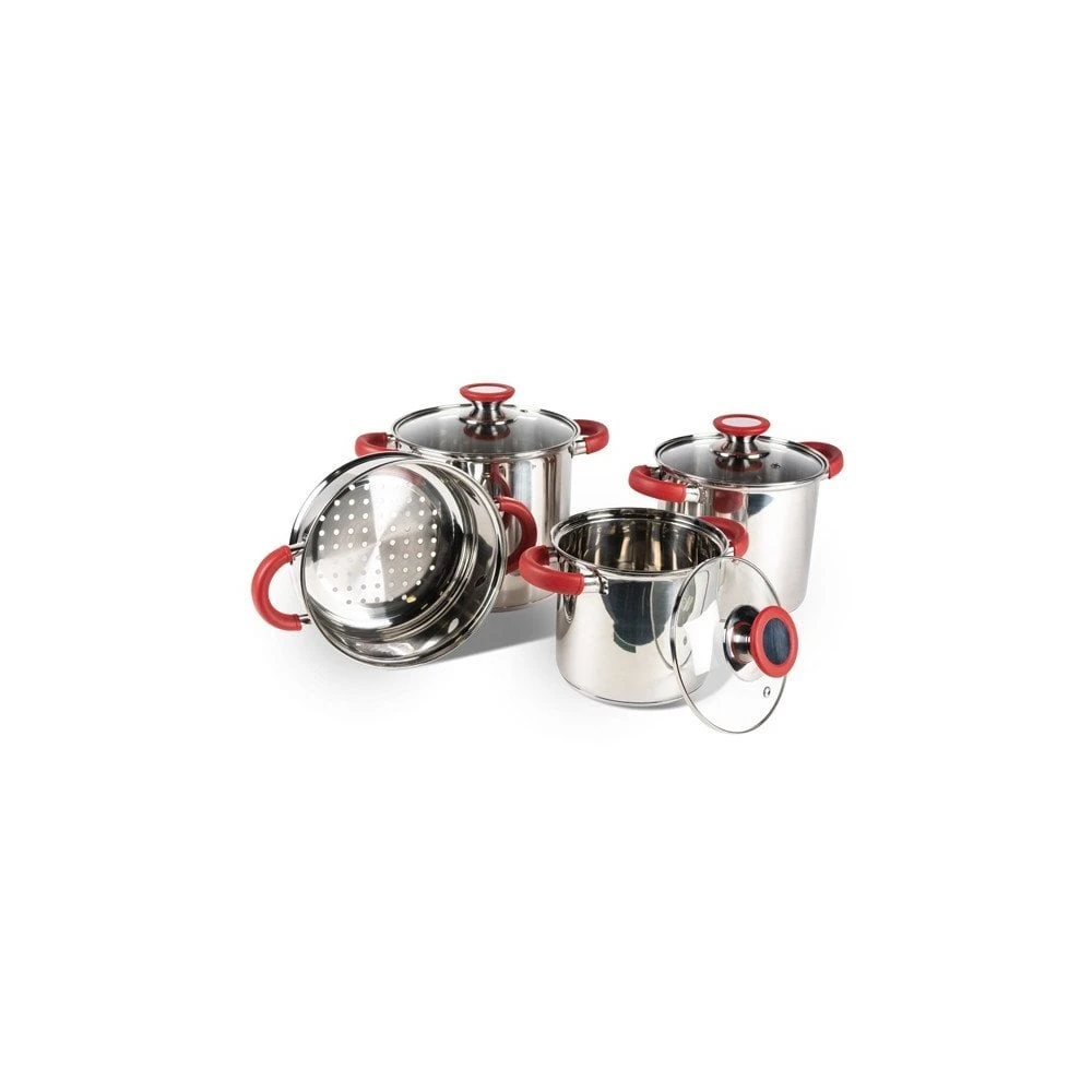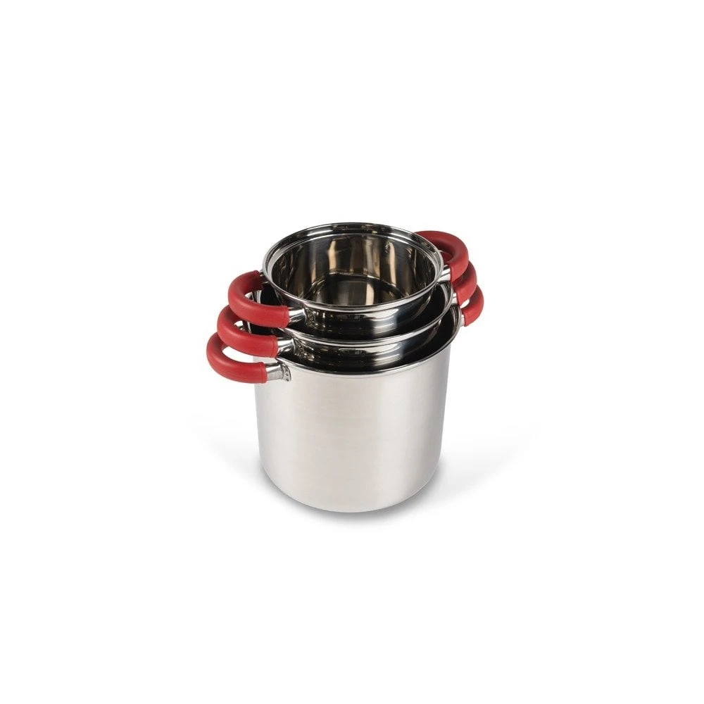 The Space Saver Delux Cook Set is designed with encapsulated bases for even heat distribution and enhanced cooking performance.