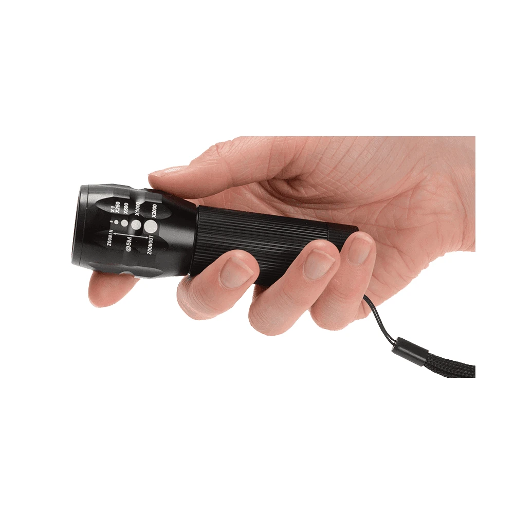 Incorporates CREE LEDs, providing a super bright beam from a single source. CREE LEDs are unsurpassed in both output and efficiency with a life span of over 100,000 hours and will provide a bright beam of light for up to 6 hours from one set of batteries. The torch has an aluminium body, which is shock proof and rain resistant. There is also a handy wrist strap for added safety.