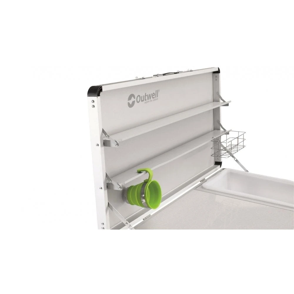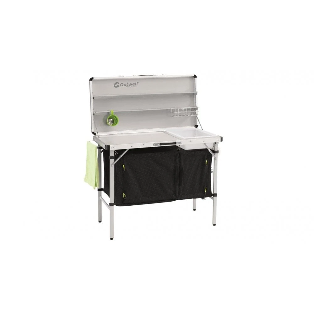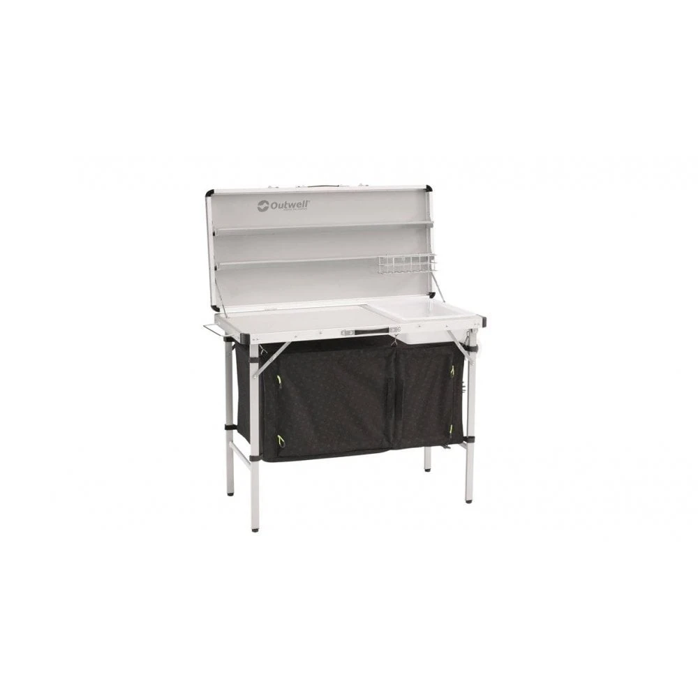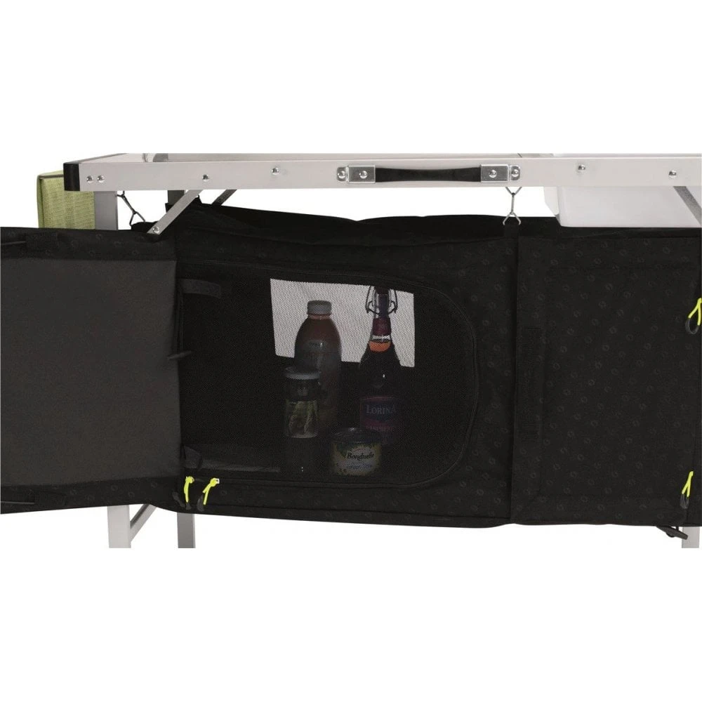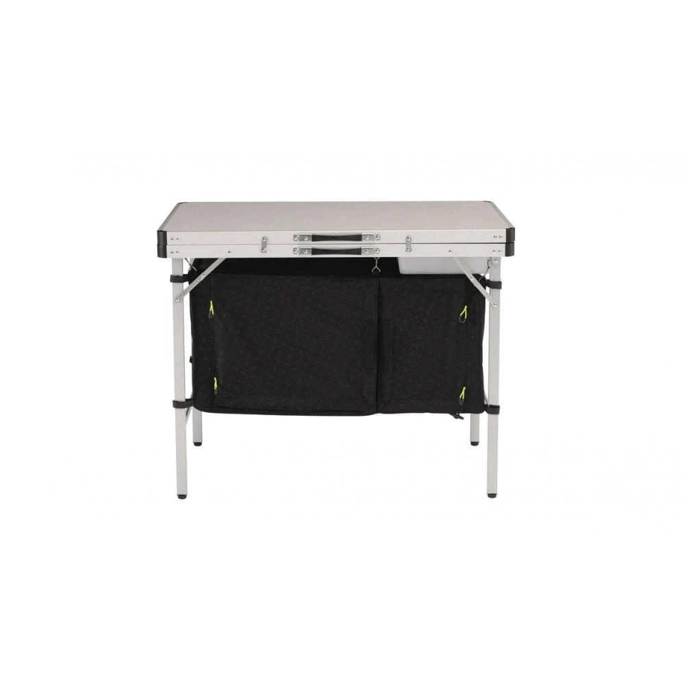 The chic logo-pattern graces the top, shelve and embossed fabric of this Drayton kitchen table from Outwell.