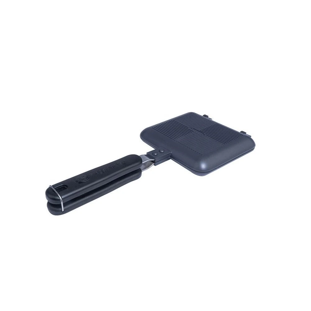 The RidgeMonkey Classic Sandwich Toaster Granite Edition features fixed cool-touch handles, riveted hinges and a full utensil set that fits inside the toaster for easy storage. The square shape also means that there is less wasted storage space than with traditional circle shaped cookware.