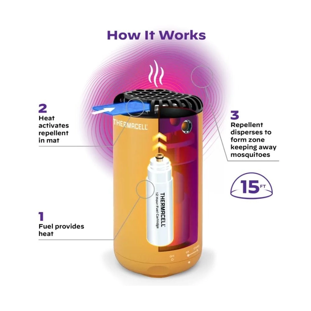 Features a 15-foot zone of mosquito protection. Powered by a safe and compact 12-hour fuel cartridge.